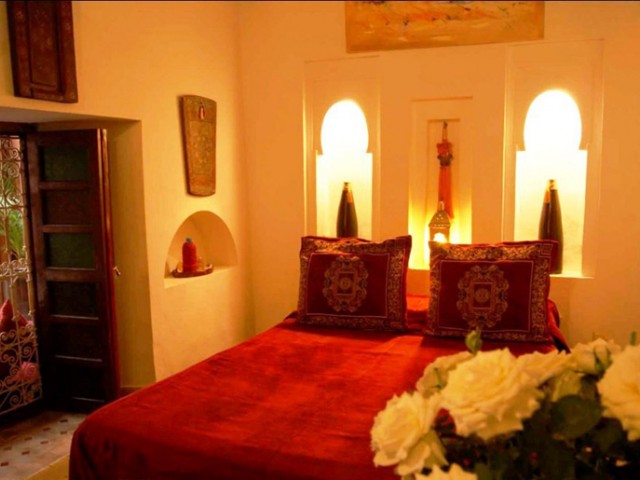 Chambre double très chaleureuse de décor rouge marrakech, chauffage, chambre en rez-de-chaussée, très fraiche en été donnant sur le patio arboré, salle de douche privative.