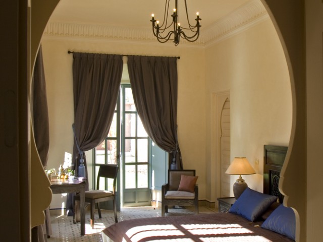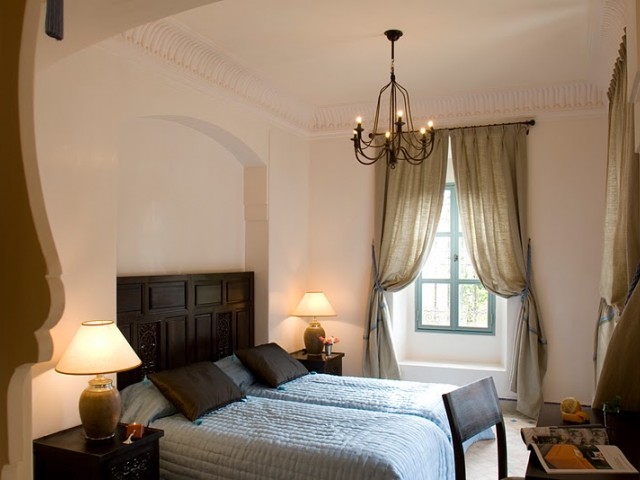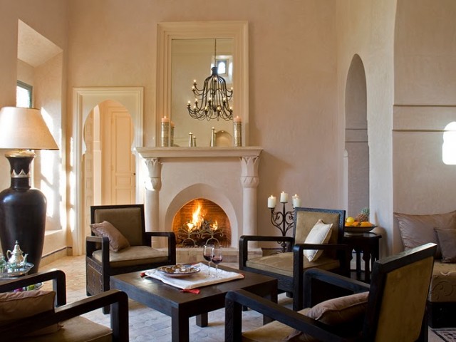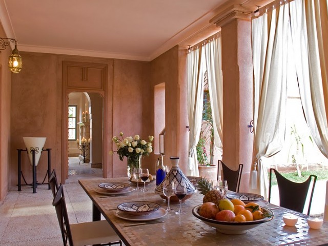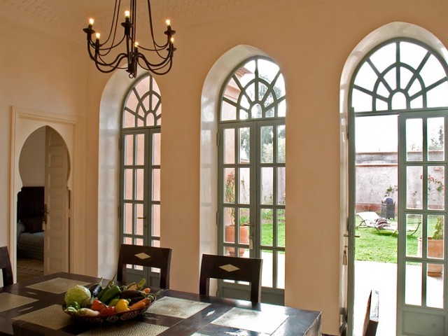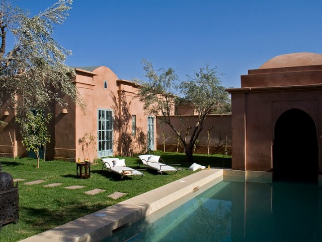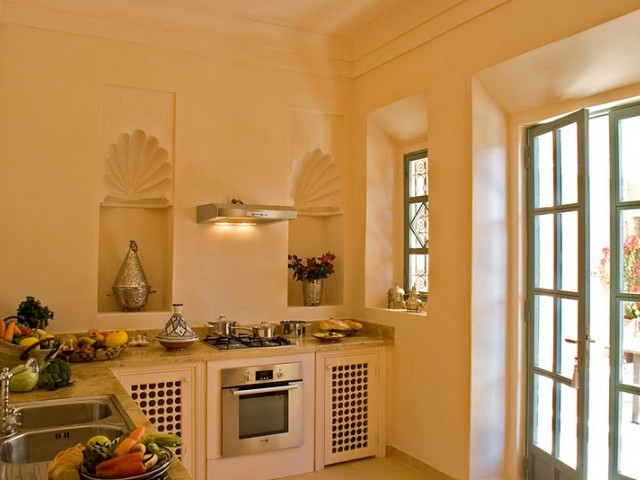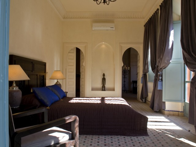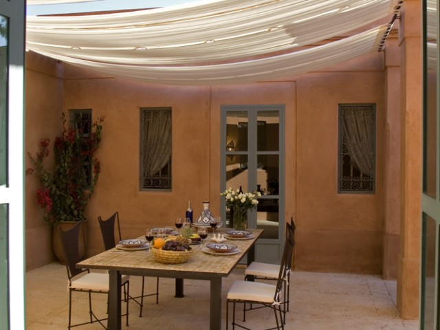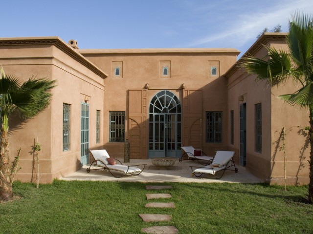 La face arrière s'ouvre sur le jardin et sur un grand patio agrémenté d'une fontaine. Une majestueuse porte à “R'taj” (traditionnelle porte en bois à ouvertures multiples) permet de fermer la baie centrale du séjour. Les ailes latérales abritent les deux chambres principales.Situé dans la partie centrale de la maison, le séjour(salon-salle à manger) distribue la cuisine et les deux chambres principales.D'un volume généreux (39 m2 e t 4,70 m sous plafond) le séjour est agrémenté d'une cheminée artisanale, et d'un b'hou, salon oriental traditionnel.La suite de maître comprend une grande chambre (26m2), un dressing, une salle de bains, des toilettes séparées et une cour privative.La deuxième grande chambre (26 m2) comprend un dressing séparé et une salle de douche (avec toilettes) agrémentée d'un magnifique plafond voûté.Grande corniche décorative au plafond. Ouverture sur le patio et le jardin par deux portes-fenêtres et deuxfenêtres.La troisième chambre (14 m2), avec salle de douche-toilettes et placards dressing, est indépendante et accessible par la cour avant de la maison.Superficie totale de la maison : 320 m2, loggias et patios inclus.La surface du terrain varie selon l'emplacement, de 675 m2 à 1 100 m2).Surface des pièces principales : séjour - 39 m2 ; chambres 1 et 2 - 26 m2 ; cuisine - 20 m2.Le jardin de la maison “Jaccaranda” est situé sur la face arrière et la piscine est dans le fond du jardin.La cuisine est fournie équipée d'un réfrigérateur de 460 l , d'un évier ainsi que d'une plaque chauffante au gaz avec four et hotte aspirante.La production d'eau chaude est assurée par des ballons électriques situés discrètement sur le toit. Le séjour, les chambres, la cuisine sont équipées de climatisations réversibles.