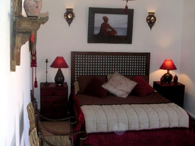 Au deuxième étage se trouve une suite lumineuse donnant sur la terrasse ! Bordeaux a un style très raffiné avec des couleurs et des meubles attrayants : un lit moucharabiehs, satin bordeaux et lin, des commodes en cuir, une magnifique salle de bain avec bassin en tadelackt violine. Elle vous donne accès au solarium.