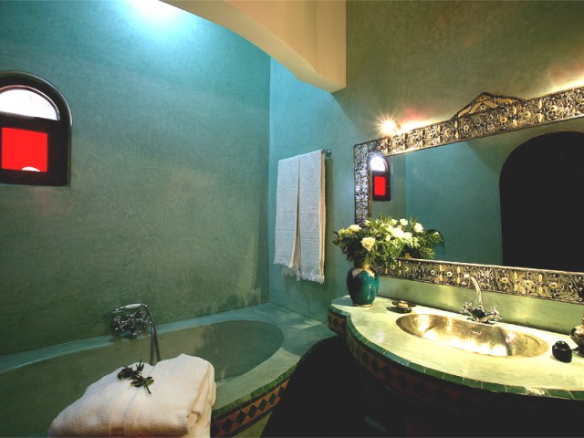 En vous rendant au premier étage, vous trouverez une vaste suite avec une vue sur la fontaine et la patio imprégnée de couleurs séduisantes et disposant d'équipements alliant le traditionnel au moderne : coin salon avec canapé, lit à baldaquin avec draps de taffetas et de velours ainsi qu'une spacieuse salle de bain avec bassin en tadelackt turquoise, d'où le nom de la suite !