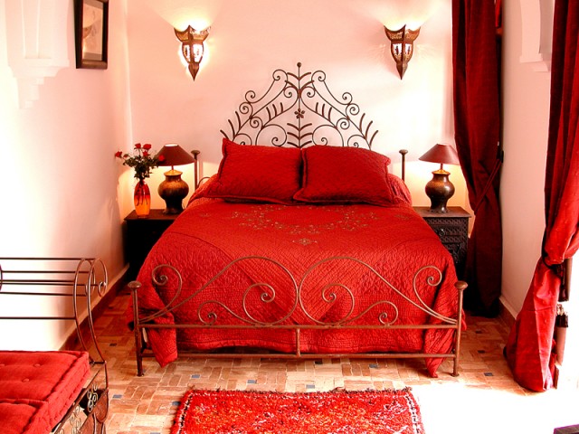 Donnant sur le patio au rez-de-chaussée, une suite exceptionnelle aux couleurs de feu équipée d'un lit en fer forgé vous accueille pour un séjour de détente. Elle dispose d'un coin salon en cèdre et cuir, un canapé en velours, une vaste salle de bain avec bassin en tadelackt rouge.