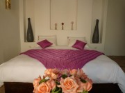 Gran Suite en el 1.o piso, con una pared cabecero en tadelakt color hez de vino, decorado en los tonos de rojo. 1 gran cama de 180 x 200 y un pequeÑo salon. ClimatizaciÓn reversible. ConexiÓn WIFI gratuita. Gran cuarto de baÑo con una baÑera en mÁrmol y aseos en tadelakt vincula de vino. Batas y secador del pelo.