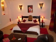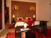Gran Suite en el 1.o piso, decorada en los tonos rojos. 1 gran cama de 180 x 200 y un salÓn ante la chimenea. Posibilidad de una cama 90 x 200 de mÁs si necesario.ClimatizaciÓn reversible. ConexiÓn WIFI gratuita.Bonito cuarto de baÑo con ducha y aseos en tadelakt rojo Marrakech.Batas y secador del pelo.