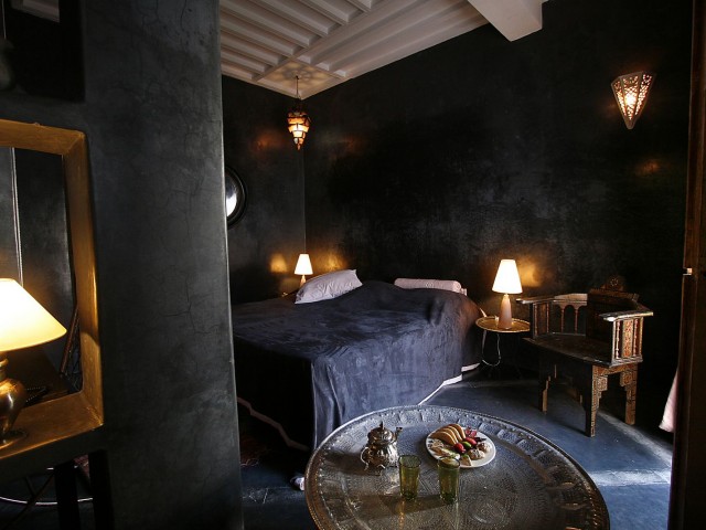 La Grise, l'ombre peut être sensuelle quand les lumières jouent avec la matière.Chambre tout en tadelakt anthracite. Lit king size, petit coin salon.TV, lecteur DVD, Accès ADSL par prise Ethernet fournie dans la chambrela salle de bain est également en tadelakt, avec une grande baignoire.WC indépendants.Air conditionné