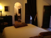 Chambre spacieuse au 1er étage, donnant sur le patio, lit double plus un lit une personne supplémentaire, coin salon, grande salle de bain en tadelakt, climatisation reversible.Lit double 180 ou lits jumeaux 90 de largetarif chambre triple 20 euros en sus