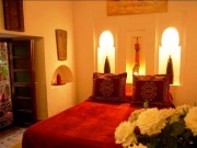 Chambre double très chaleureuse de décor rouge marrakech, chauffage, chambre en rez-de-chaussée, très fraiche en été donnant sur le patio arboré, salle de douche privative.