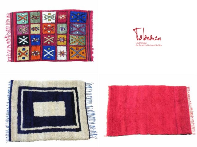 L'authentique des secrets de l'artisanat berbère S'inspirant du nom du village distant de 60km de Marrakech, Talamanzou est devenu aujourd'hui une véritable marque de conception et de confection de tapis berbères, une référence dans le monde de la création de tapis. Talamanzou propose des tapis fabriqués comme autrefois mais avec un large éventail de décors différents et de tailles variées et même la possibilité de les commander sur-mesure, dans les teintes souhaitées. Le show room vous propose des tapis unis, des reproductions de tapis anciens ainsi que des tapis contemporains révélant la richesse exceptionnelle de l'artisanat berbère.