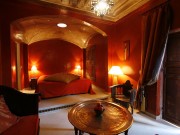 Dorée comme les cuivres et la patine d'or sur les murs.Très belle suite. Magnifiques zouaks aux plafonds entourant, dans la partie chambre, un puit de lumière.Pour plus d'intimité, des rideaux peuvent séparer la chambre et le salon.Lit king size pour les adultes, ainsi qu'un lit une personne dans le salon.TV, accès ADSL par cordon Ethernet fourni.La salle de bain est en tadelakt, très grande baignoire, double lavabos, wc séparés.