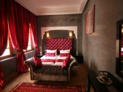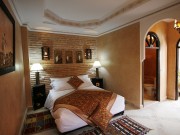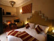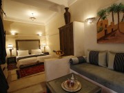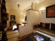 Vast suite on the ground floor, viewing on the fountain, calm and fresh. White tadelakt walls warmed up with sumptuous red and ancient silks under superb engraved plaster.Equipped with 1 double bed 160 x 190. Very beautiful bed out of cedar wood featuring a typical Berber design. Dressing table with mirror.Living room with large seat in tadelakt and cushions.Bathroom with bath-tub all in tadelakt red. Copper wash-hand basin and WC, Hair dryer. Reversible air-conditioning. Safe.