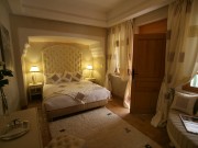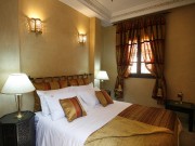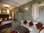 Large suite on the 1st floor, with sight on the fountain, decorated in pure white and silver.Walls of tadelakt, with sumptuous plaster planks and ceilings. Large bed 160 X 200 out of noble wood with silver plated incrustations. Dressing table with mirror. Private terrace accessible through an interior spiral staircase, with zelliges table and deck chairs, with the shelter of the glances.Living room with ancient Moroccan seats. TV satellite. Safe.Bathroom with bath-tub in tadelakt white, maillechort wash-hand basin and WC.Hair dryer. Reversible air-conditioning.