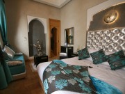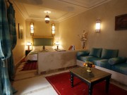 Sapphire or Beautiful beyond BlueVast suite on the ground floor, viewing on the fountain, calm and fresh. White tadelakt walls and beautiful major blue fabrics. Splendid engraved plaster ceilings.Equipped with 2 beds 90 X 200, twins or double to choose. Very beautiful bed head out of maillechort. Dressing table with mirror.Living room with large seat in tadelakt and cushions.Bathroom with shower all in tadelakt blue, maillechort wash-hand basin and WC,.Hair dryer. Reversible air-conditioning. Safe.