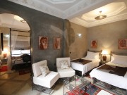 Vast suite on the 1st floor, with sight on the fountain, being able to accommodate very comfortably 4 people. Splendid walls of gray tadelakt, decorated with admirable planks and ceilings of carved plaster.Four-poster bed out of wrought iron, 140 X 190 on the one hand, and 2 beds 90 X 200, joined or separated. Dressing table with mirror.Living room with ancient Moroccan seatsBathroom with bath-tub all in tadelakt grey, maillechort wash-hand basin and WC,.Hair dryer. Reversible air-conditioning. Safe.