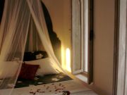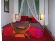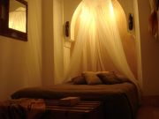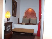 Take a stroll in the ochre tones of this room. It is located on the small patio, underneath the orange tree and the bamboos which give it an uncomparable freshness : an oasis nearby the Atlas mountain...This room is the freshest one in the house. It's the only one that opens on the small patio that seems like a private garden. It is and equiped with a wide bed (160 cm.), a private bath room with a shower and WC, all covered with tiling and traditionnal tadelakt, and other pieces of furniture (cupboard...).