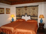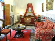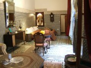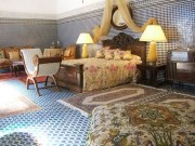 One of the most beautiful suite of Riad with its typical decorsand its autehntic ceilingin cedar..(45m²)Located on the gorund floor, it includes a largebed, a dressingroom, a living room inrecess of the room, table, and secretary.Large Bathroom with 2 wash-hand basins, shower, bath-tub...