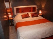 With l' stage, giving on the gangway of the patio, great continuation where l' orange acidulous of fabrics lights the tadelakt chocolate of the chimney. Bed linen of great quality. Bed: reads double into 160. Bathroom in tadelakt and zelliges with shower. Air-conditioning heating